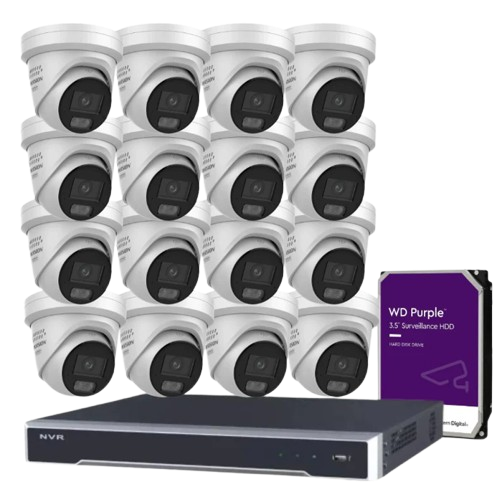 Hikvision 8MP CCTV Kit with 16 DS-2CD2386G2-I(U) Turret Cameras + 16-Channel PoE NVR DS-7616NI-M2/16P + HDD – AcuSense AI, Audio, 8K HDMI, IP67 Weatherproof