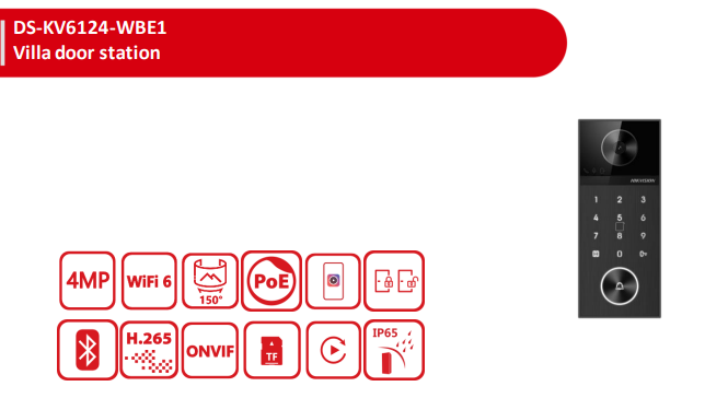The Hikvision DS‑KV6124‑WBE1 is a high-end villa door station suited for premium residential and light commercial use. Offering sharp 4MP video, a broad 150° viewing angle, support for two separate locks, and a variety of unlocking methods including PIN code, this unit delivers both flexibility and strong security. With seamless integration into Hik‑Connect and support for PoE, it provides modern and convenient access control.
