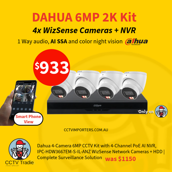 Dahua 4-Camera 6MP CCTV Kit with 4-Channel PoE AI NVR, IPC-HDW3667EM-S-IL-ANZ WizSense Network Cameras + HDD | Complete Surveillance Solution