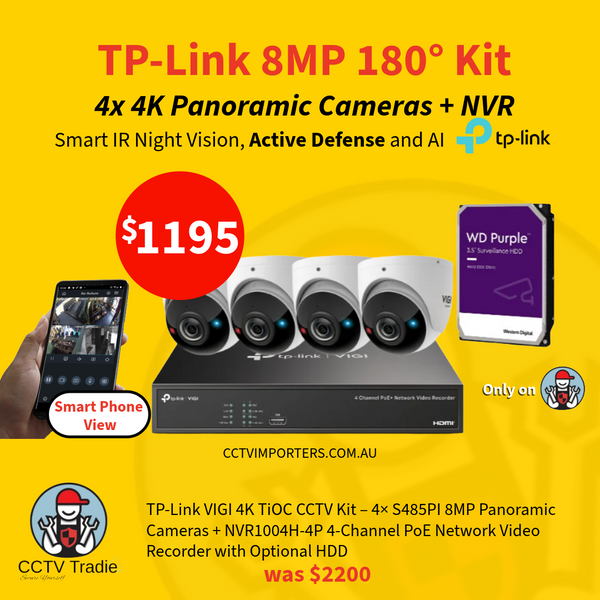 TP-Link VIGI 4K TiOC CCTV Kit – 4× S485PI 8MP Panoramic Cameras + NVR1004H-4P 4-Channel PoE Network Video Recorder with HDD
