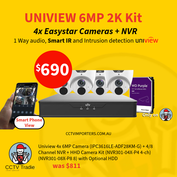 Uniview 4x 6MP Camera (IPC3616LE-ADF28KM-G) + 4/8 Channel NVR + HHD Camera Kit (NVR301-04X-P4 4-ch) (NVR301-08X-P8 8)