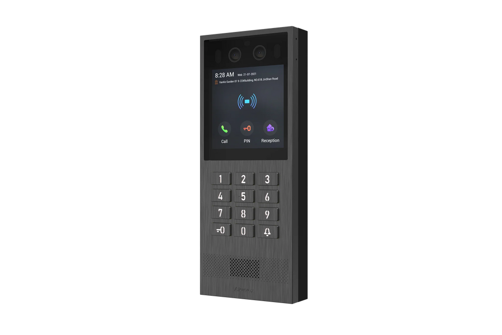The Akuvox X912K is a high-performance video door phone engineered for premium residential and commercial access control applications, where reliability, versatility, and elegant design are essential. Featuring a 4″ capacitive touchscreen, physical numeric keypad, and a robust aluminum vandal-resistant housing, this compact unit is ideal for properties with limited wall space that demand top-tier technology and advanced functionality.