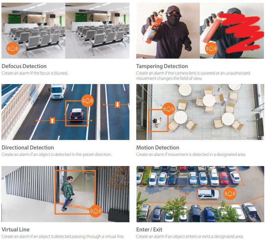 Wisenet Q series cameras are equipped with a wide range of Intelligent Video Analytics features, helping users detect different types of incidents and have full situational awareness of their facility