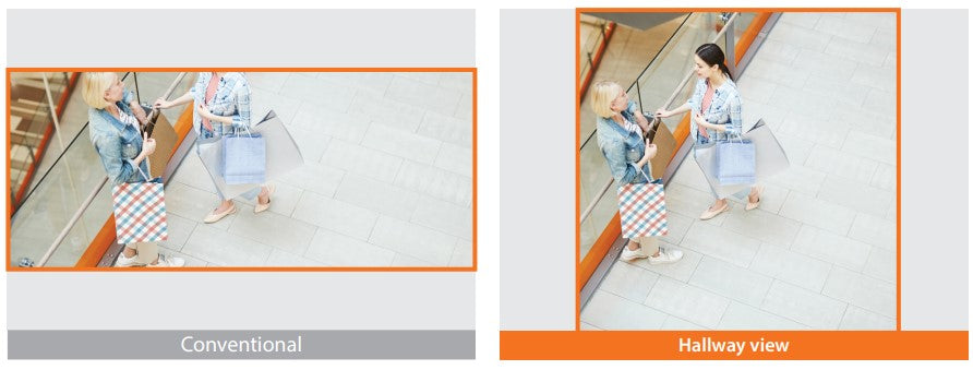 Conventional horizontally oriented video streams waste bandwidth and storage along their edges in narrow areas such as store aisles or long hallways. Hallway view created a vertically oriented 3 : 4 or 9 : 16 ratio video stream to maximize usable image space in a narrow environment.