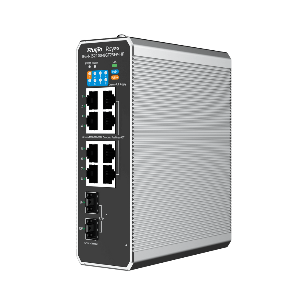 RG-NIS2100-8GT2SFP-HP 10-Port Cloud Managed Industrial Switch – 1 PoE++ Port, 7 PoE+ Ports, 2 SFP Uplinks, 90W PoE Output, Industrial-Grade