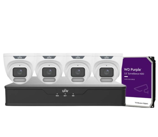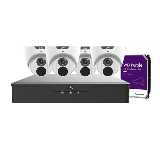 Uniview CCTV 8MP Kit – 4× IPC3618SS‑ADF28K‑I1 Turret Cameras + 4‑Channel Ultra265 PoE NVR(NVR501‑04B‑P4‑IQ), Includes HDD