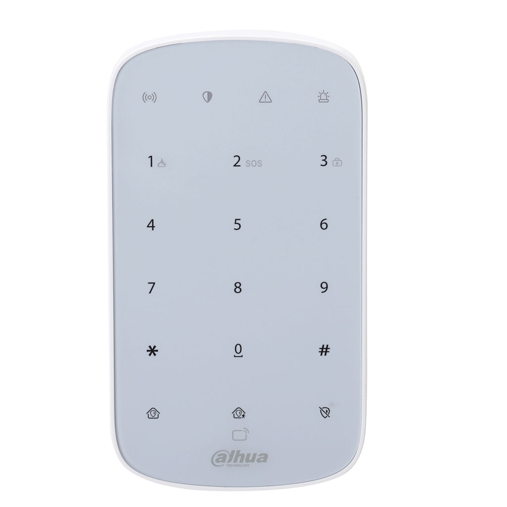 Dahua DHI‑ARK30T‑W2 Wireless Keypad supports password/IC card arm/disarm, medical/fire/emergency shortcuts, temperature sensing, cloud updates, and secure RF communication — ideal for smart alarm systems in homes and businesses.