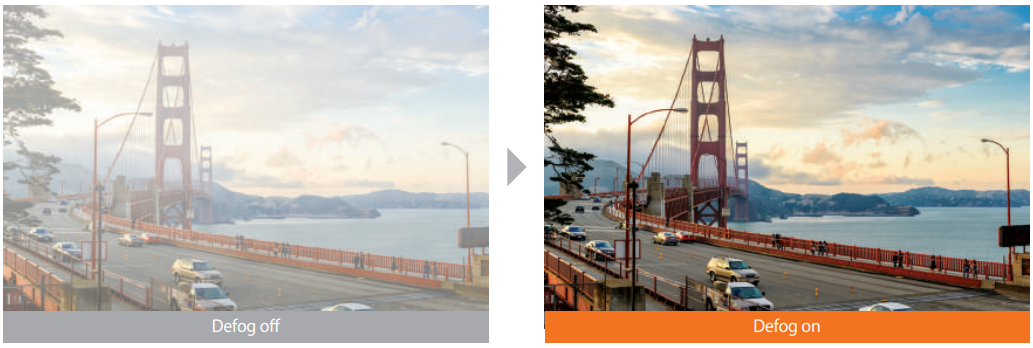 Defog function is an image processing technology which helps increase image clarity in poor weather conditions such as fog or yellow dust. The visibility of the cameras can be enhanced in any weather condition so that users can monitor full-time.